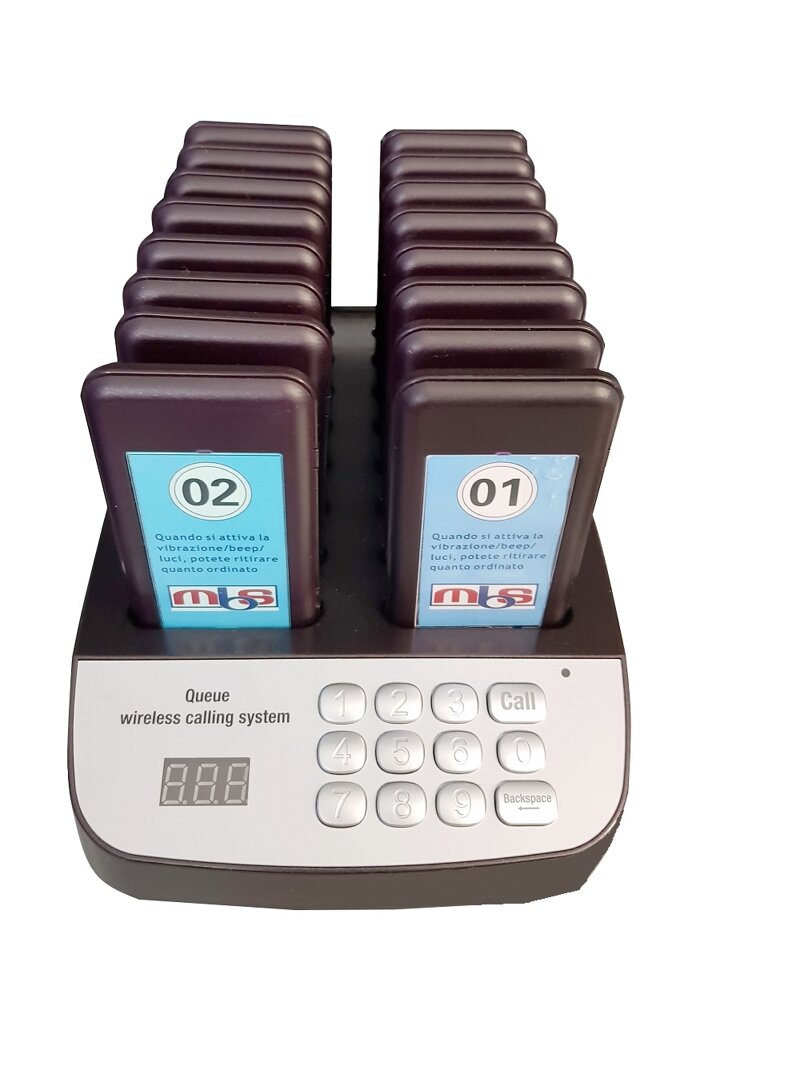 SCARICA IL NOSTRO DEPLIANTSCARICA IL NOSTRO CATALOGOOur Wireless Customer Call System is particularly suitable for self-service catering, where the preparation of the dish is awaited. Customers receive a PAGER eliminates queue and can comfortably sit at the table. As soon as the platter is ready, the disc vibrates and emits an acoustic and visual signal; is the signal that they can go to the counter to collect what they ordered !!It is also particularly suitable for managing the waiting for a free table in a restaurant.The range of action is about 200 metersThe system includes:Control unit with keyboard and charging base included;N ° 16 pagers eliminates queue;