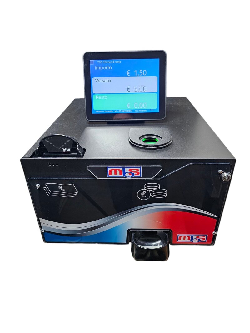 Utilizza il modulo SCR per le banconote con la gestione di 3 tagli disponibili per il resto ai clienti ed il modulo CLS con 8 contenitori per un totale di 3.600 pezzi circa per la gestione delle monete.