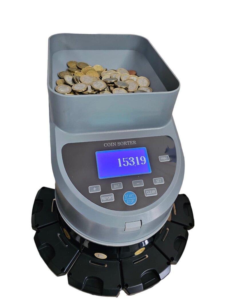 It has 7 tubes that counts and divides coins from € 2.00 up to € 0.02.The counting speed is approximately 1,200 coins / minute.